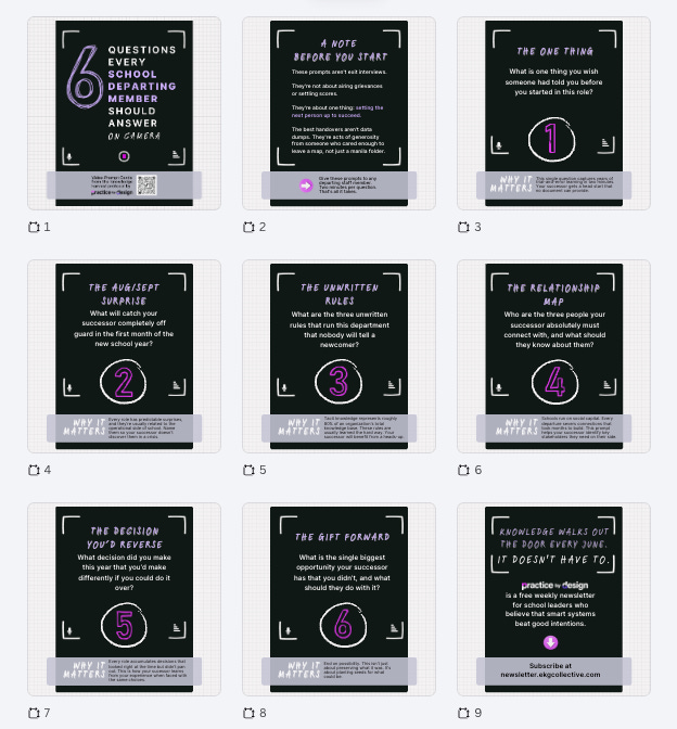 Build Video Time Capsules: A 2-minute video of a departing coordinator answering one specific question is worth more than a hundred pages of documentation. Keep the prompts specific. To ease the process, I’ve built a set of cards you can use:
